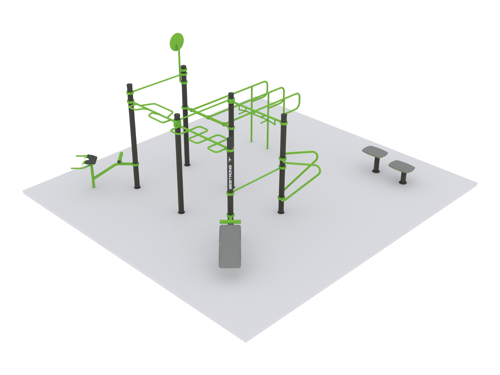 Der BeStrong MEDIUM 52 Fitnesspark ist ein mittelgroßer Bereich, hat aber eine große Kapazität. Es eignet sich daher perfekt für Sportvereine und Schulen.