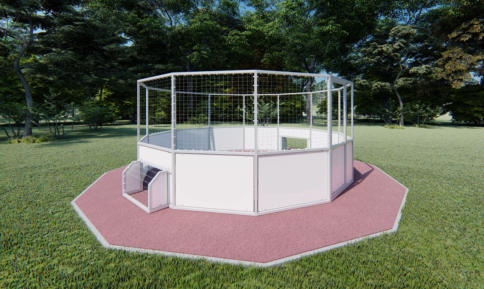 Kleine Torpfosten sammeln erfolgreiche Treffer in zwei gegenüberliegenden Feldern. Die Größe der Torpfosten beträgt 1 x 0,5 m. In einem weiteren Element der Verkleidung ist eine Tür mit Edelstahlscharnier integriert, die einen einfachen Zugang zum Käfig ermöglicht.